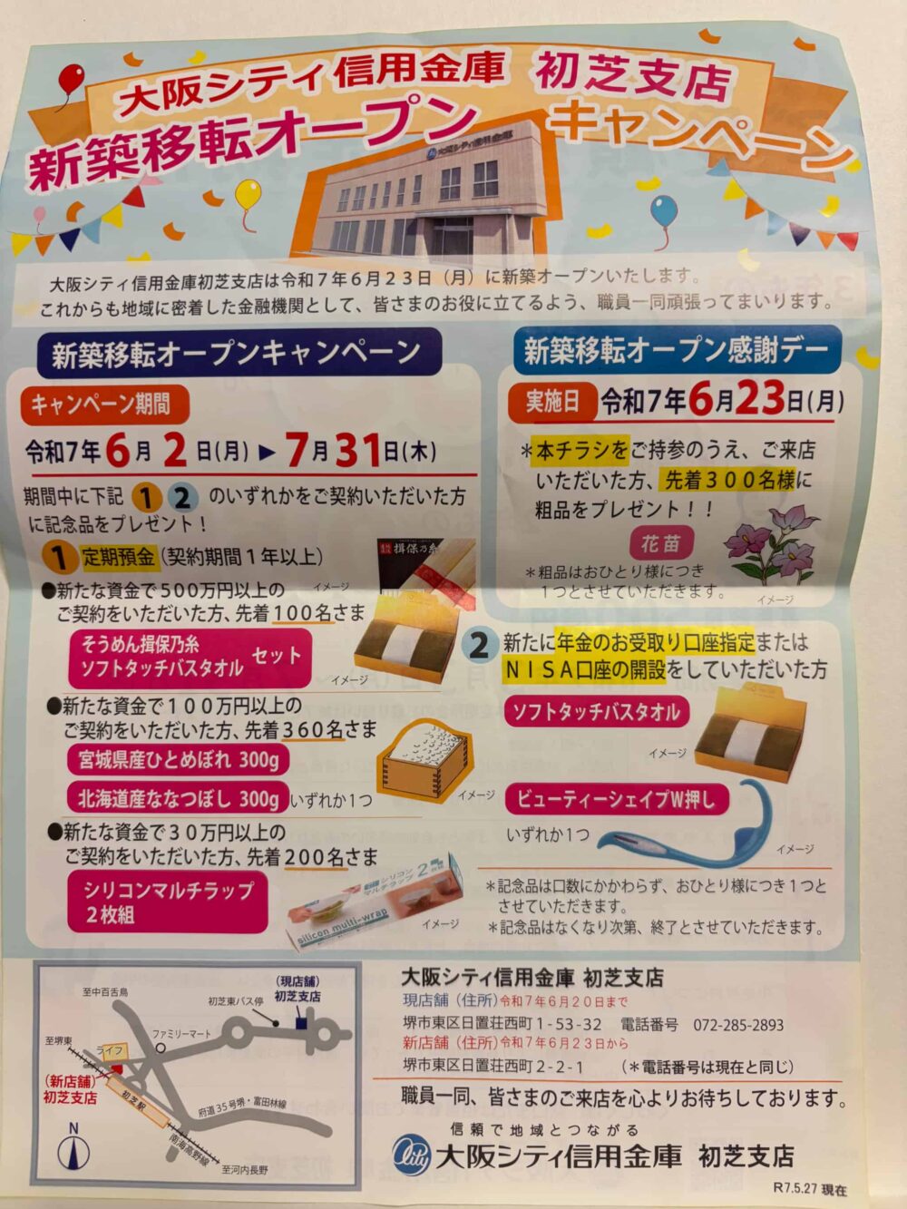 堺市東区・初芝駅近くに『大阪シティ信用金庫・初芝支店』が6月23日(月)に新築移転オープンしますよ!