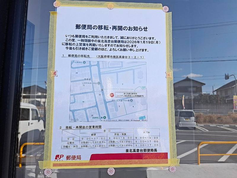 「泉北高倉台郵便局」が、1月19日に移転リニューアルオープンします☆彡