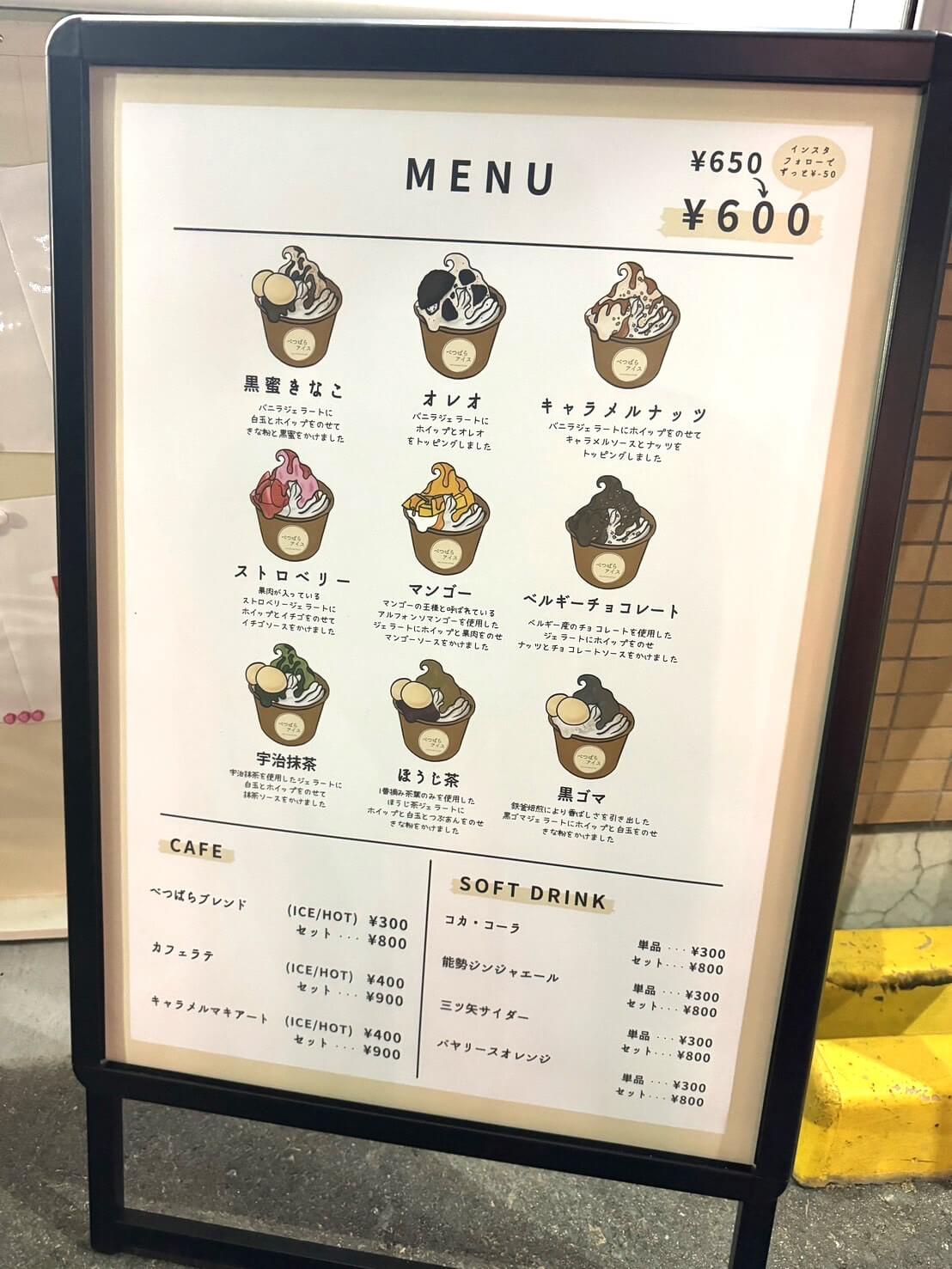外食でお腹いっぱい食べた後でも、べつばらアイスなら別腹で楽しめます笑