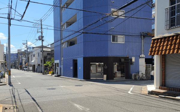 一際目をひく青い建物の1階です。
