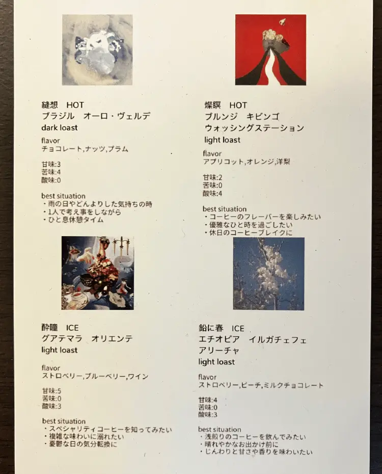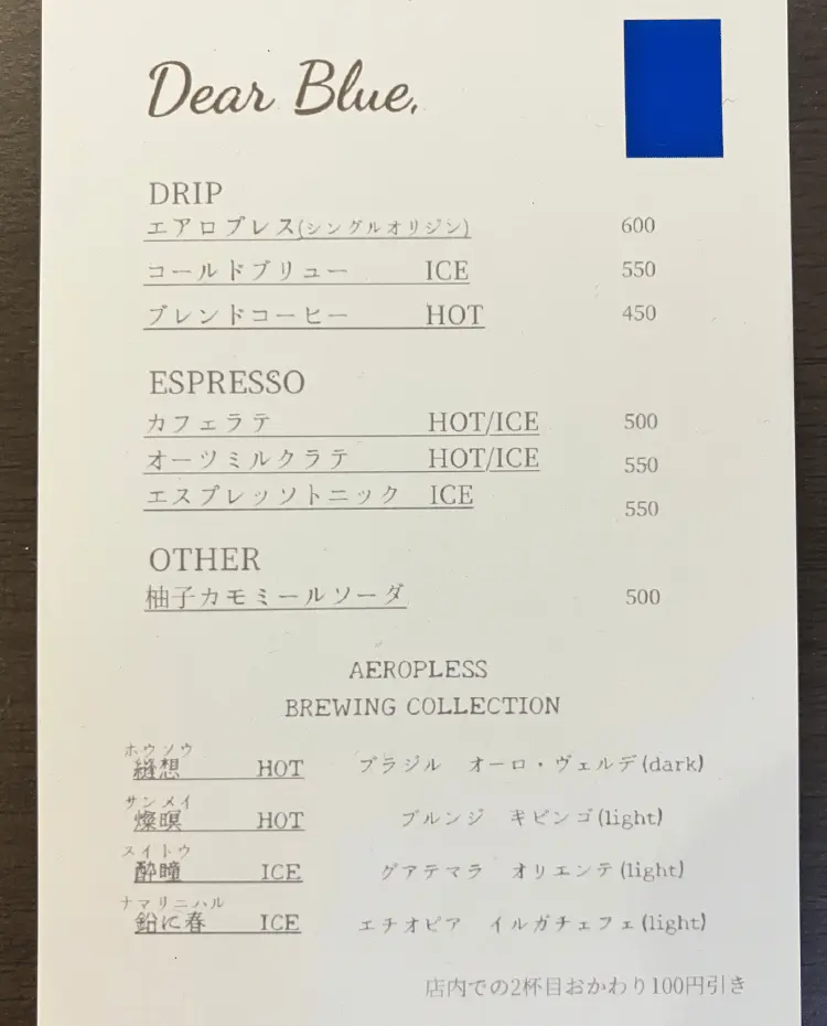 『DEAR BLUE COFFEE』にちなんで、手紙を模したおしゃれなメニュー表。