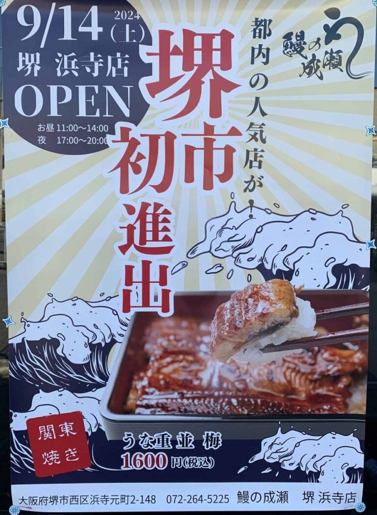 9月14日(土)に『鰻の成瀬 堺浜寺店』がオープンしますよ!