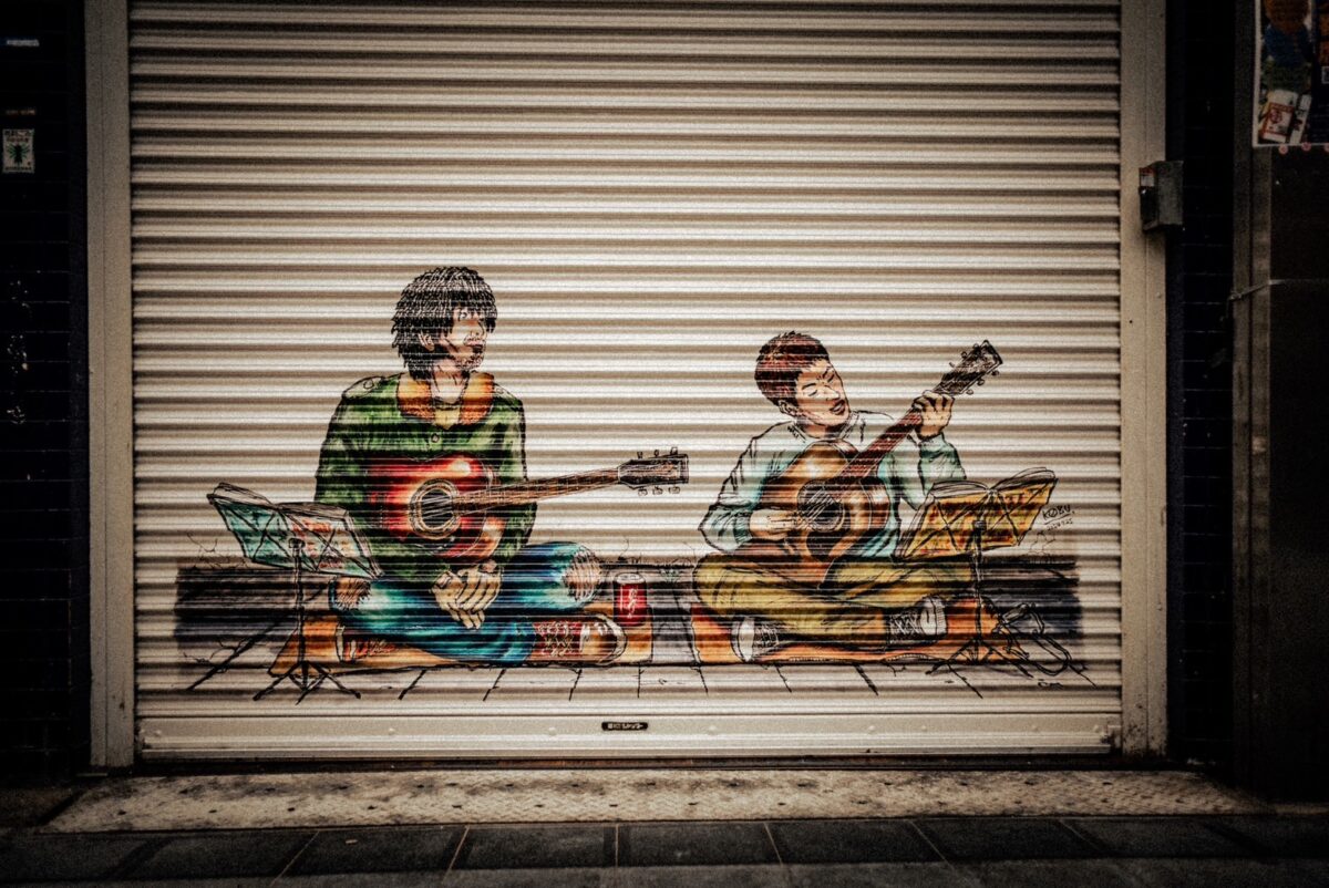 お店の外のシャッターには、当時商店街で2人がストリートライブをしていた頃の様子を、小渕健太郎さんが描き下ろした絵がプリントされているんです。