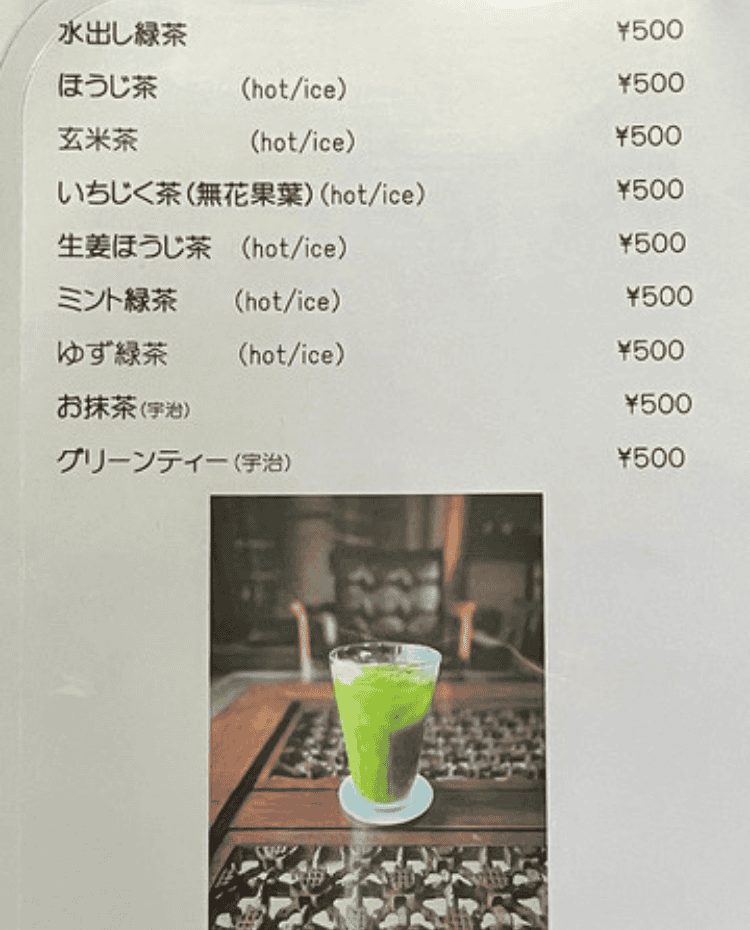 十勝餡と白玉団子に濃厚抹茶の抹茶ぜんざいや、宇治抹茶が添えられた抹茶ソフトクリーム、抹茶アイスに抹茶シロップ、バニラアイスにフジコーラシロップがかかったアフォガードも。
