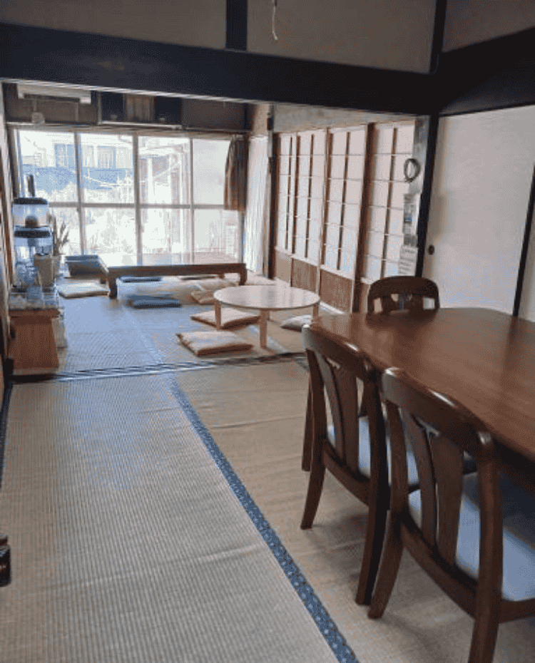 学童保育施設の中に併設されていて、1階には子供たちの憩いの場の広い和室と庭、2階には座敷席やレンタルスペース、そして物物循環所があります。物物循環所では不要になったものを寄付をしたり、また貰って帰ることもできます。