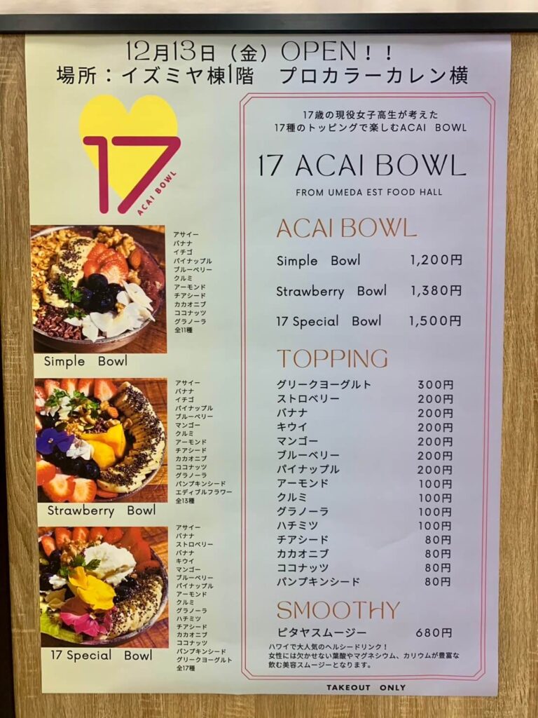 堺市南区・アクロスモール泉北に12月13日(金)、アサイーボウルのテイクアウト専門店『17ACAIBOWL』がオープンするようです!!