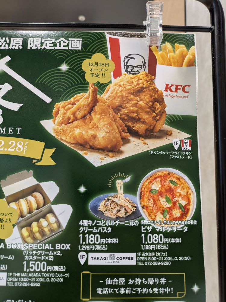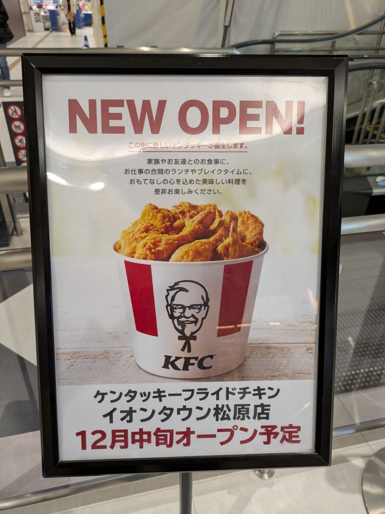 「ケンタッキーフライドチキン」が、松原市のイオンタウン松原1Fフードコートにオープン予定らしいですよ。