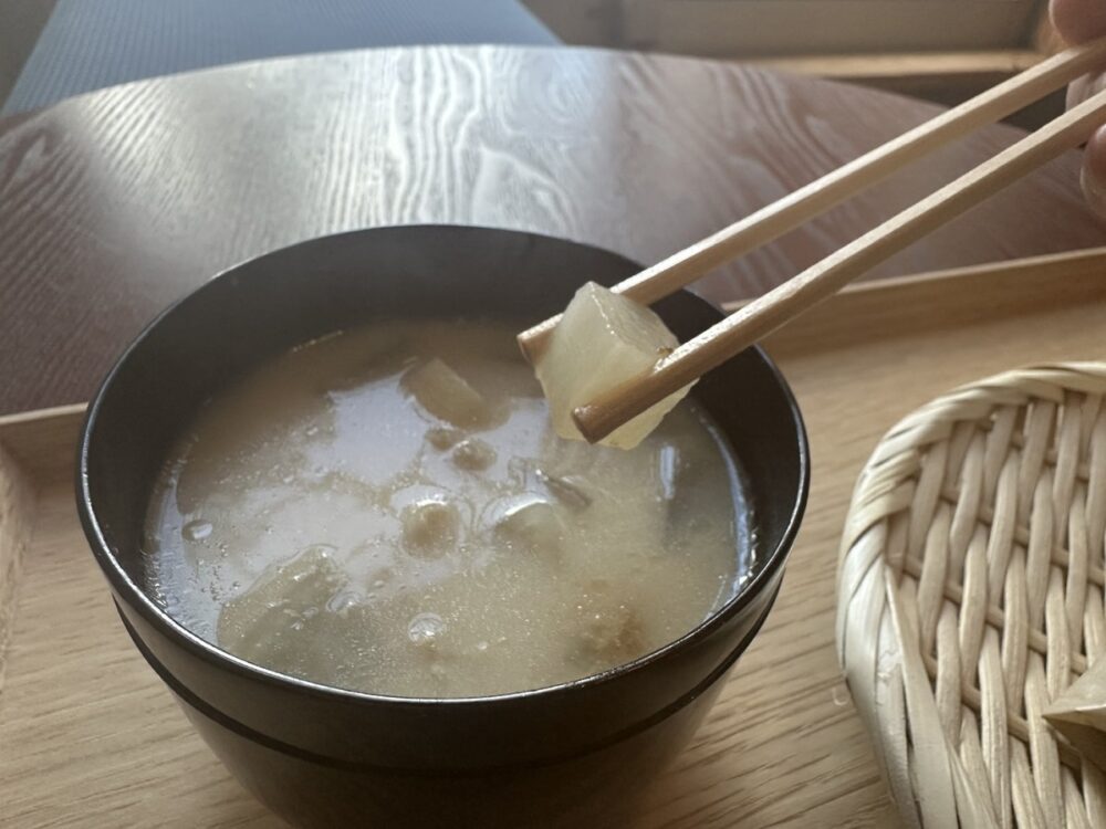 日替わりみそ汁「かす汁」もいただきました。豚肉やこんにゃく、大根、人参、ごぼう、揚げなどがたっぷり入った具沢山の一杯で、ほっとする優しい味わいでした。