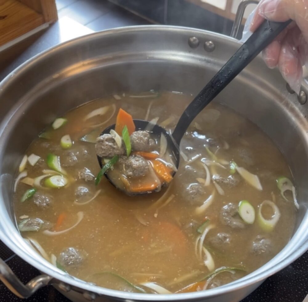 おむすびと一緒に味わいたいのが、具だくさんの日替わり味噌汁。野菜を大きめに切り、しっかりとかむことで満足感を得られる工夫がされています。