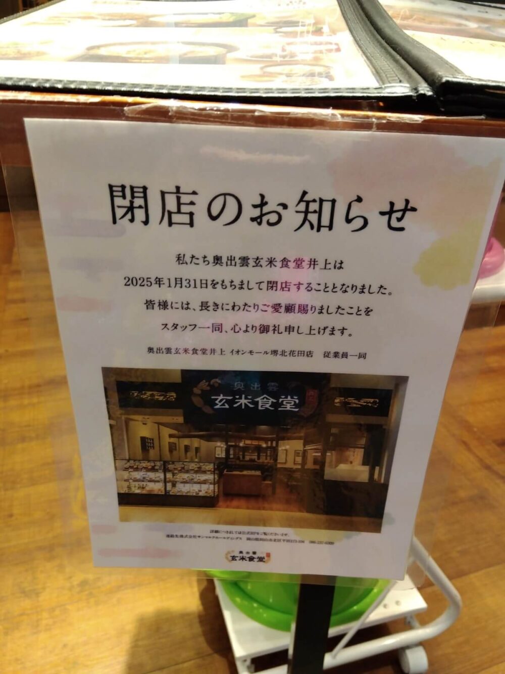 イオンモール堺北花田4階にある『奥出雲玄米食堂』が、2025年1月31日をもって閉店するそうです。