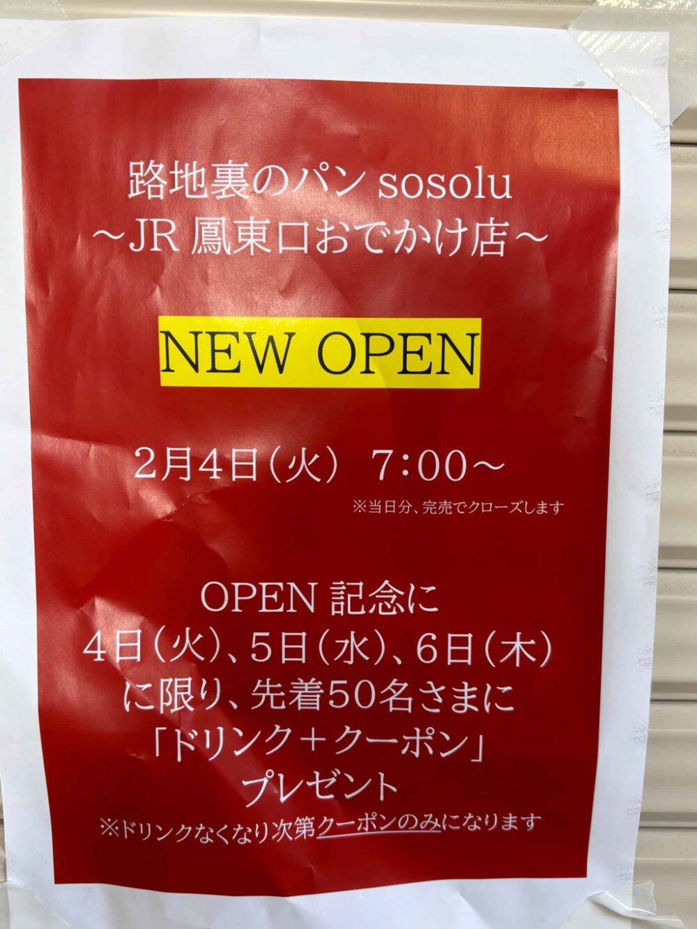 『路地裏のパンsosolu JR鳳東口おでかけ店』が2/4にオープンしますよ。