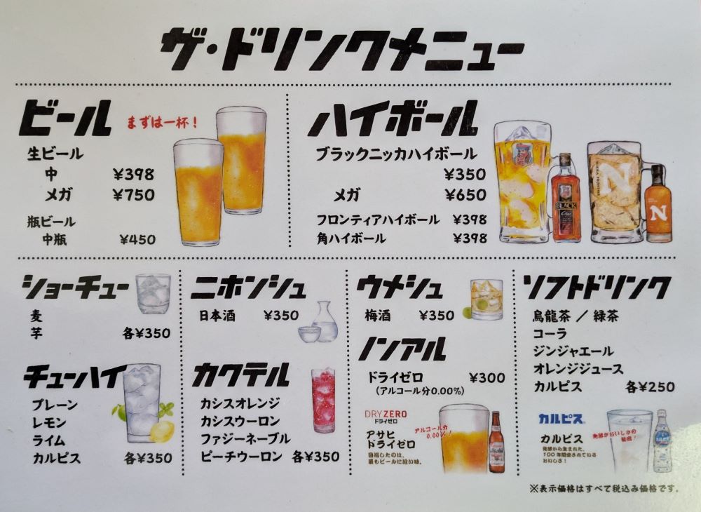 特筆すべきはなんといってもドリンクの価格で、生ビール(中)は驚きの「398円(税込)」!(※価格はすべて取材時のもの)