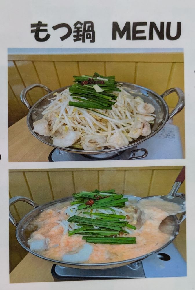 野菜たっぷりの「しょうゆ味のもつ鍋」と、「明太とろろもつ鍋」が美味しそう…。