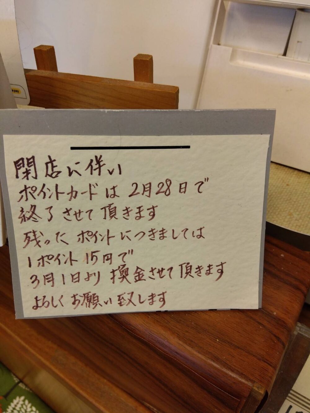 既にお持ちのポイントカードは2/28まで300円ごとに1ポイント押してもらえて、3/1から閉店までは1ポイント=15円引きで使用できるとのことでした。