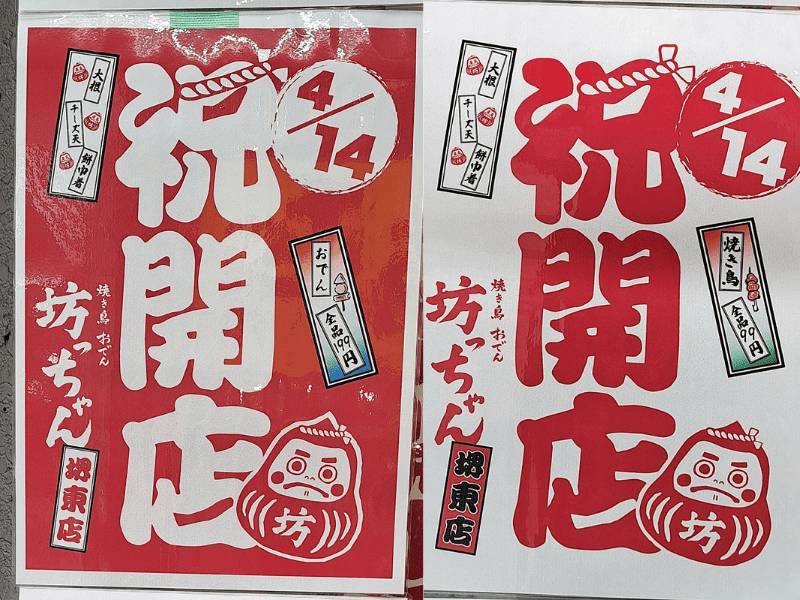 お店前には紅白ポスターで、開店のお知らせが貼っています。