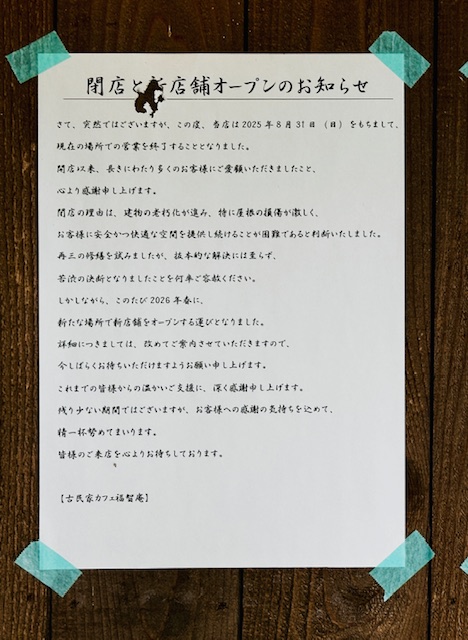 河内長野市・河合寺にある『古民家カフェ福智庵』が移転のため、2025年8月31日に現在の場所での営業を終了するそうです。