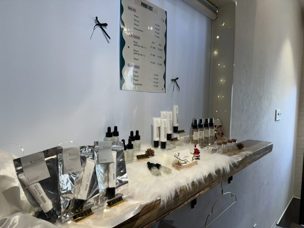 店頭のホワイトボードには、おすすめメニューやネイルサロンの空き状況が書いてあって、当日ふらっと立ち寄ってネイルの飛び込み施術をお願いなんてことも叶いそう!