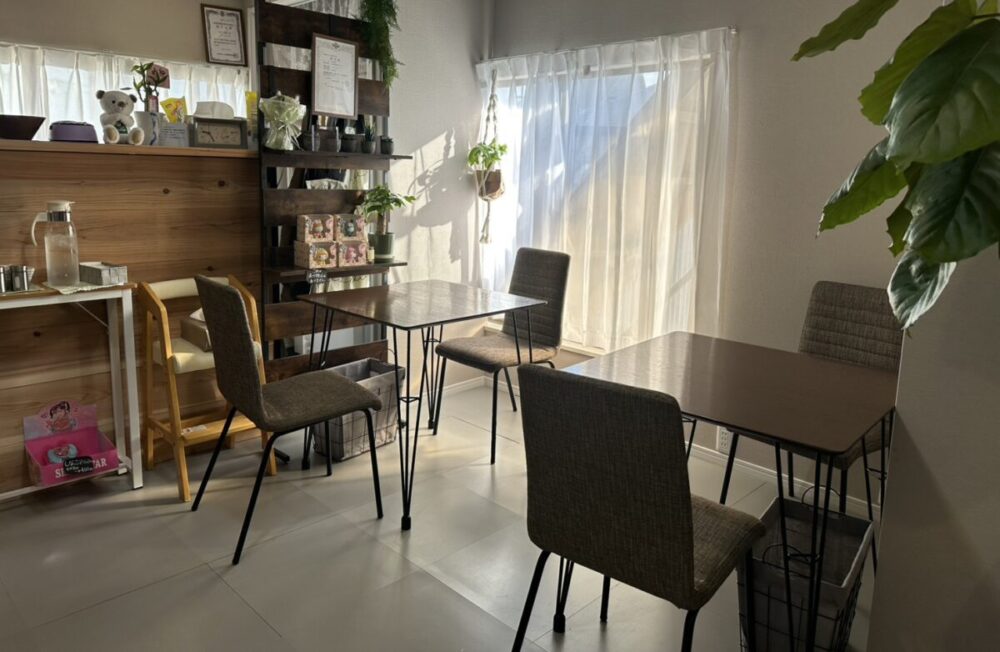 店内に入ると、明るい日差しが差し込む空間に、落ち着いた色合いのテーブルと椅子が並び、ほっと一息つけるような穏やかな雰囲気が広がっています。