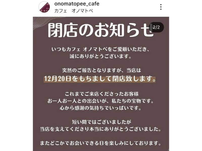 住宅街にある、隠れ古民家の「カフェオノマトペ」が、公式Instagramでお知らせをだしています。