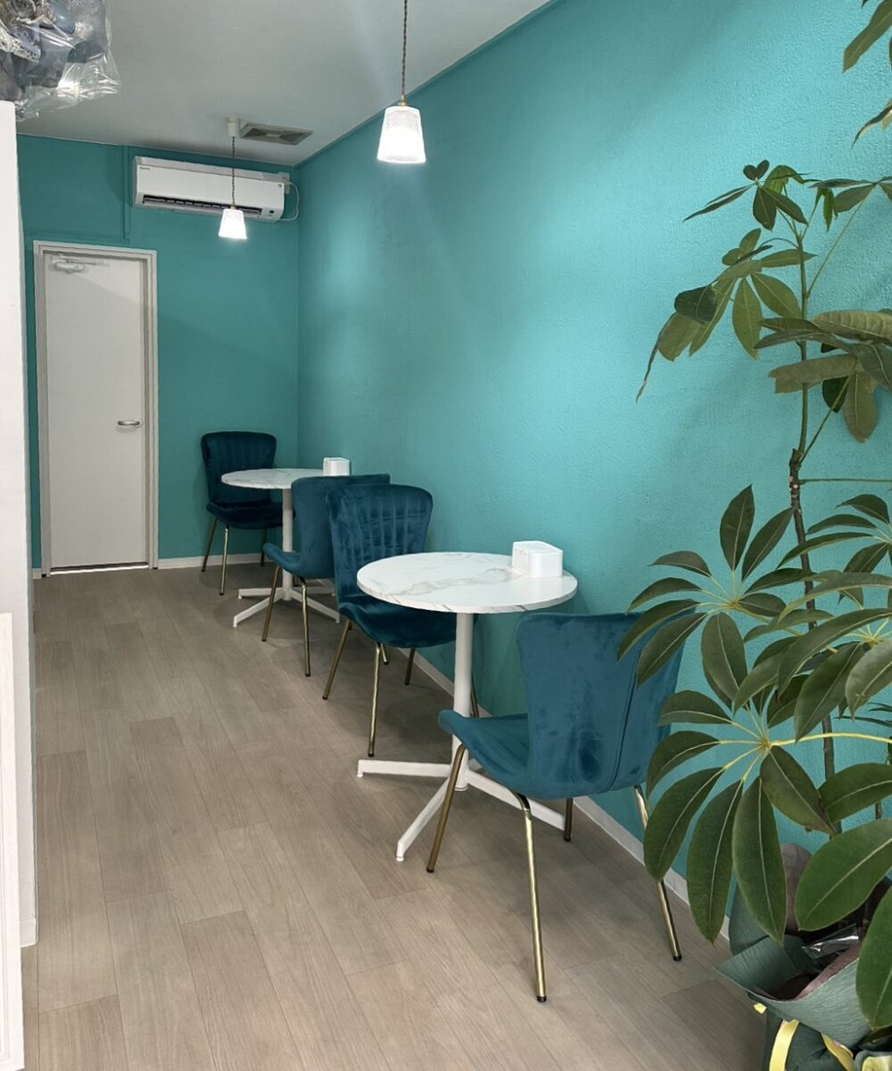 鮮やかなブルーの壁が目を引くおしゃれな店内で、一歩足を踏み入れた瞬間にテンションが上がっちゃいます。