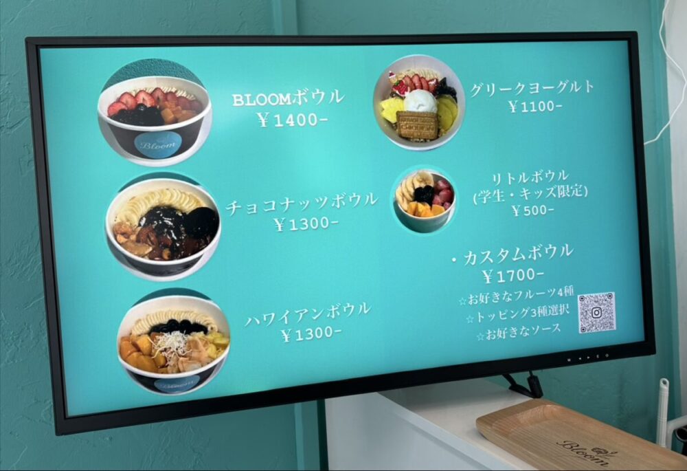 メニューも豊富で、定番の「BLOOMボウル」や、バナナたっぷりの「チョコナッツボウル」、南国気分を味わえる「ハワイアンボウル」など、どれも新鮮なフルーツがこれでもかってくらい盛り付けられています。