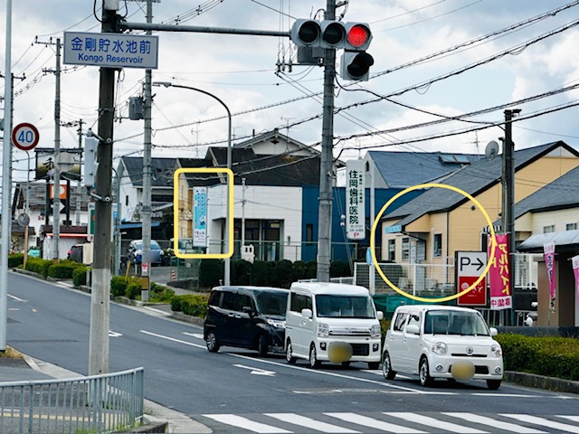 場所は202号線の金剛貯水池前の交差点からスグのところにあり、道路沿いの空色の看板が目印です。