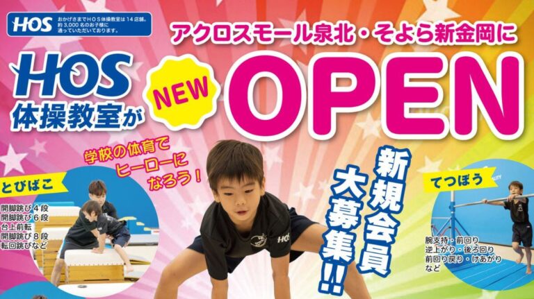 4歳から小学校6年生を対象にした体操教室『HOS体操教室 泉北原山台校』が、堺市南区・アクロスモール泉北 A館2Fにオープンしました。