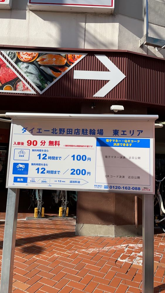 ダイエー北野田店の駐輪場東エリアの利用料が、無料から有料に変わりましたよ!