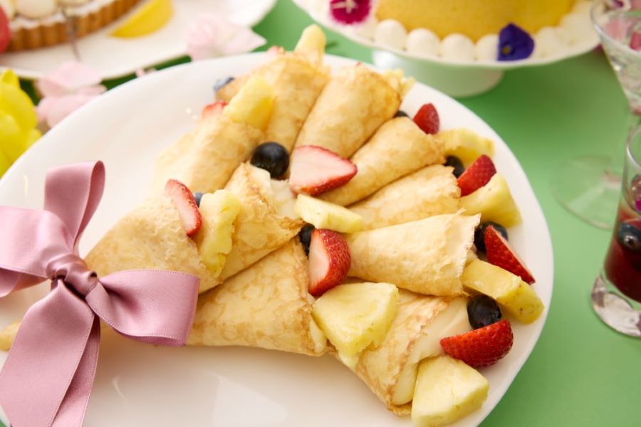 ブーケのようなフルーツクレープは、色とりどりのフルーツが花束みたいにぎゅっと詰まって、見た目もキュート♡