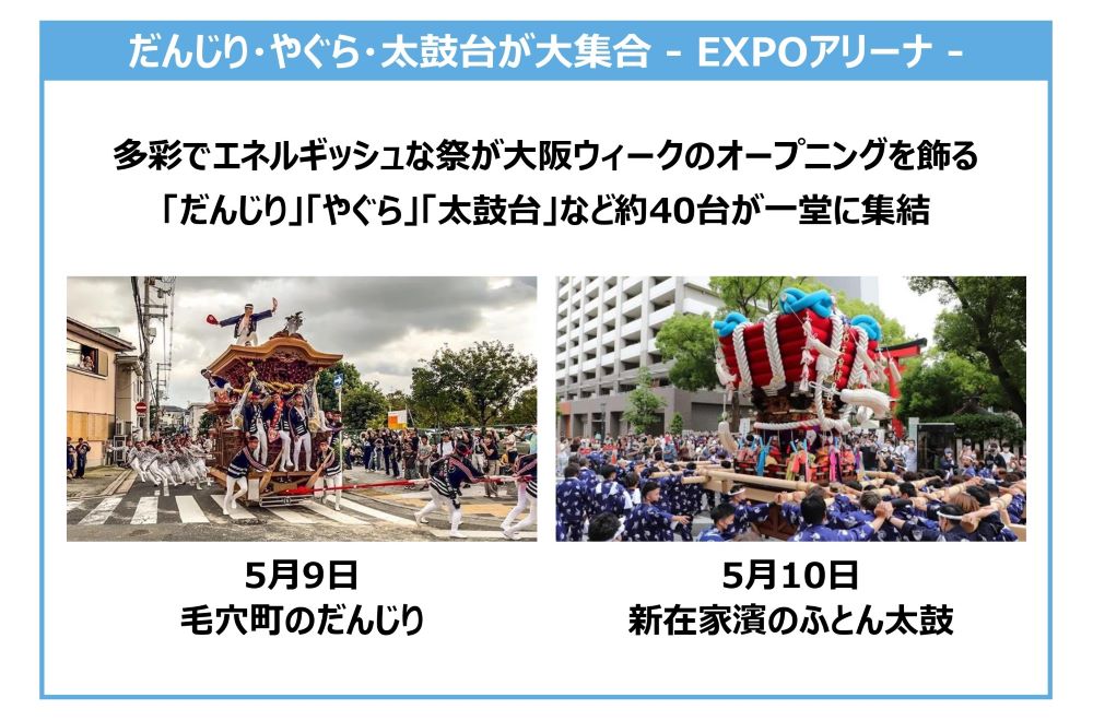 「EXPOアリーナ」では、大阪ウィークのオープニングを飾る「だんじり」「ふとん太鼓」「やぐら」等約40台が一堂に集結![5月9日(金)、10日(土)]