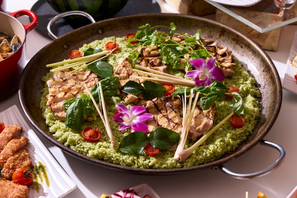 「バジル風味のチキンパエリア」は大きなチキンソテーがどーん!トマトの赤とバジルの緑のコントラストも映えます♡