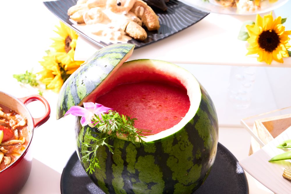スイカをまるごとくり抜いた器の中に入っているのは・・・なんと「スイカのガスパチョ」!