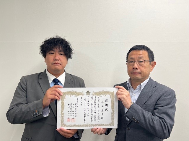 感謝状は、日々の防犯活動に尽力する大阪府堺防犯協議会会長の河盛幹雄氏と、大阪府堺警察署長警視正の平山信幸氏より授与されました 。