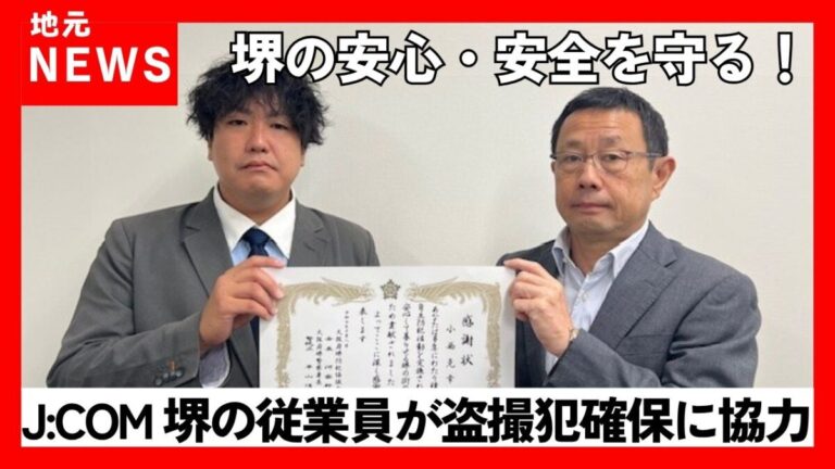 ケーブルテレビ事業などを展開する株式会社ジェイコムウエスト 堺局(J:COM堺・局長:武石英士氏 )の従業員(堺局所属)が、盗撮犯の確保に協力し、その功績が評価され、2025年10月8日(水)に「感謝状」を拝受しました 。