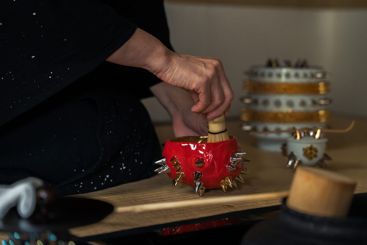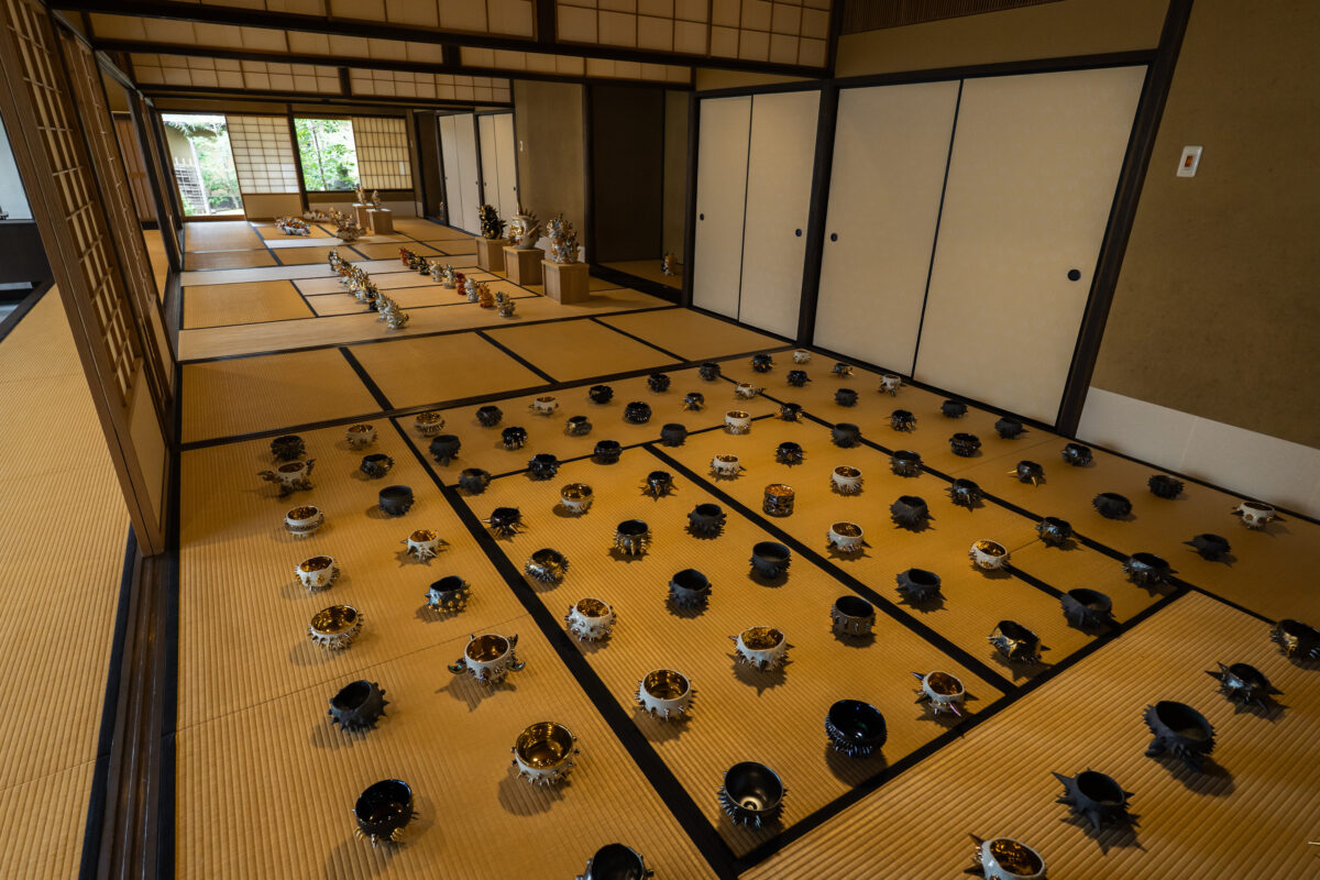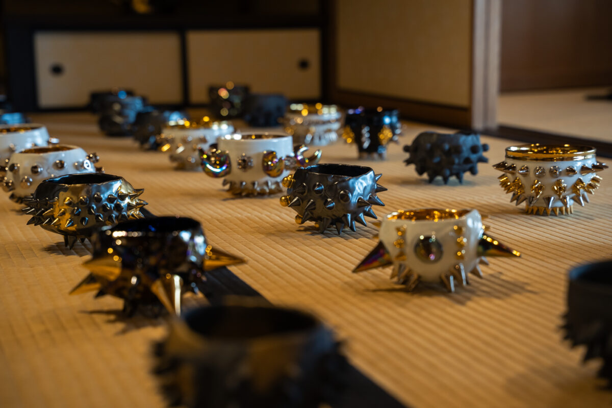 「スタッズ(棘)」をモチーフにした、一見パンクで前衛的な作品が、茶室という静謐な空間に見事に溶け込んでいました。