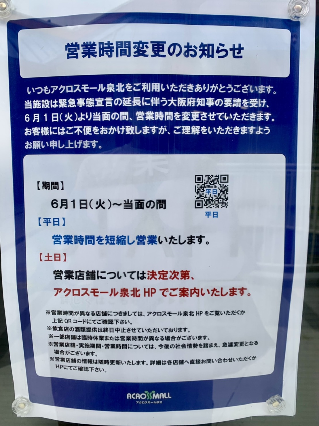 6月1日より緊急事態宣言の解除となる日まで、営業日および営業時間が変更。
