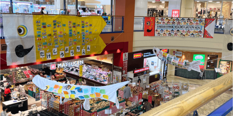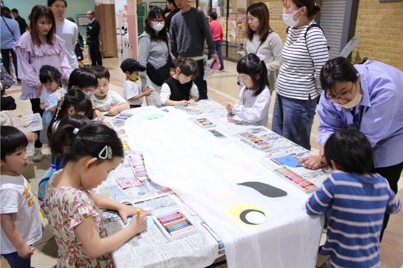 会場には「泉北幼稚園」「原山台幼稚園」「たけしろ幼稚園」の園児さんが作ってくれた色とりどりの巨大こいのぼりが元気に泳いでいます。