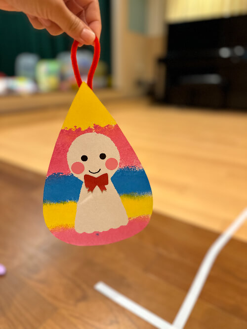 工作ではてるてる坊主型のティッシュに絵の具をつけて、ポンポンポン!思い思いの柄に仕上げた後、飾りつけをするととてもかわいい作品ができました。