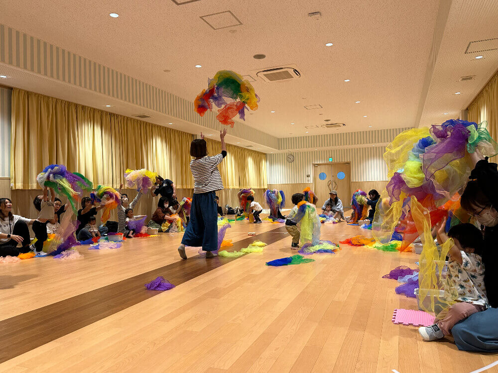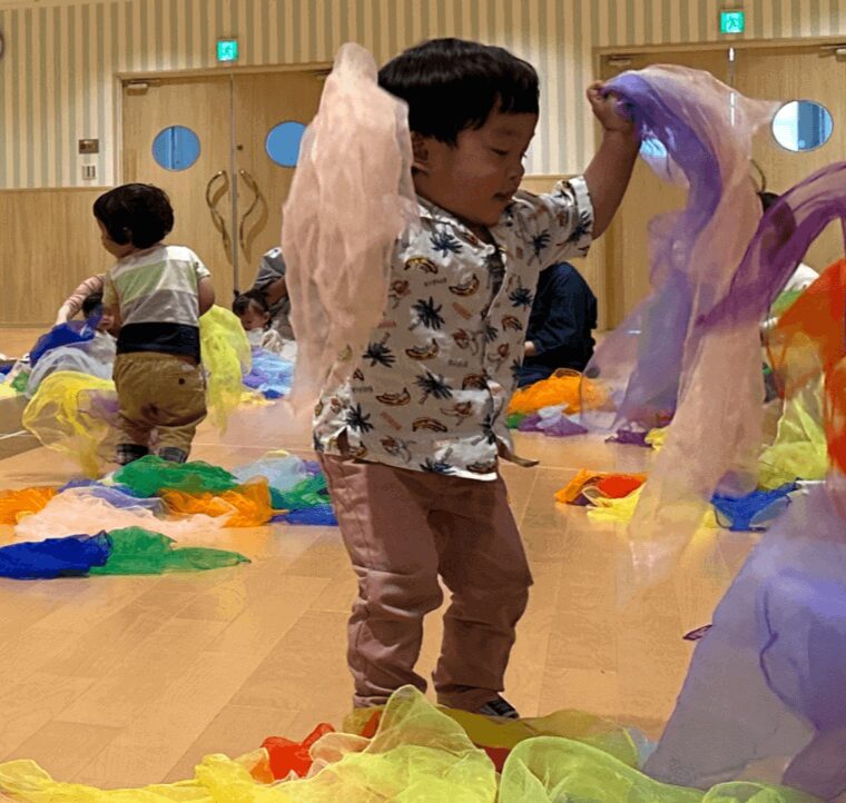タンバリンやマラカスを持って歌ったり、ふわふわのカラースカーフをポーンッと投げると大興奮!