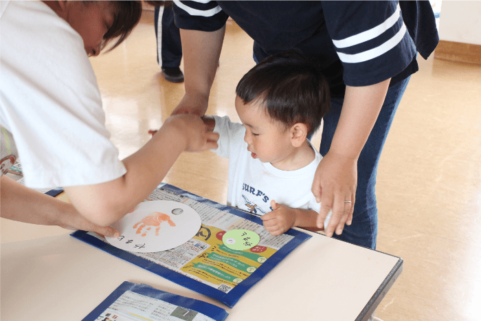 まずは、2階の大きなホールで手形付うちわの制作をしました。ママといっしょにペッタンと手形をとりました。