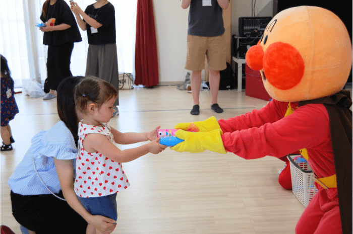 先生と一緒にリズム遊びでは、お母さん、お父さんとのスキンシップにとてもうれしそうな子どもたち。先生とのダンスの後は『人気キャラクター』が登場!!会場に大歓声が響き渡りました。