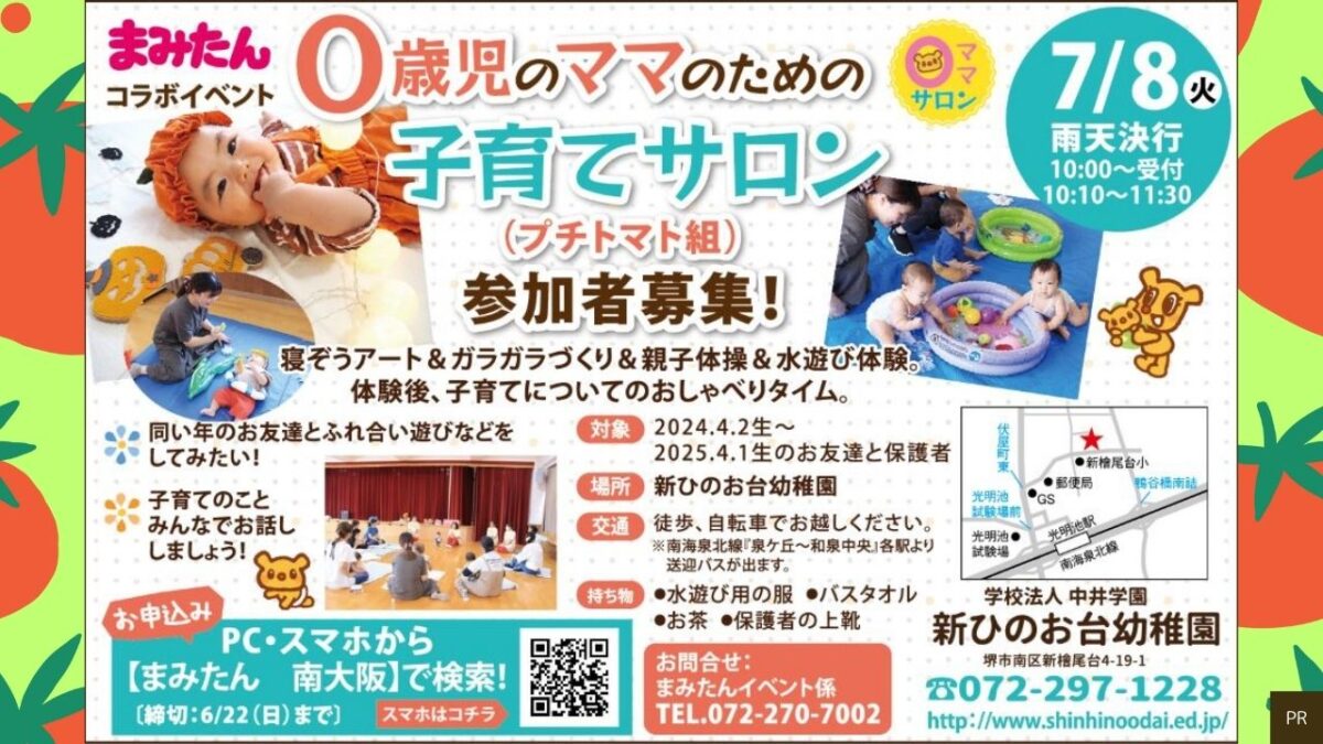0歳児のママのための子育てサロン『プチトマト組』 2025年7月8日(火)に、堺市南区「新ひのお台幼稚園」にて「0歳児のママのための子育てサロン(プチトマト組) […]