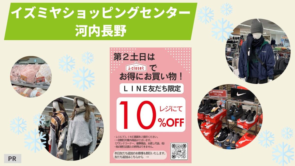 3日間限定!LINE友だちなら3階「i-closet」で10%OFF!新春のまとめ買いチャンス到来!@イズミヤSC河内長野