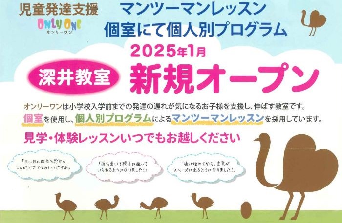 2025年1月に「児童発達支援 オンリーワン深井教室」がオープンしますよ~! オンリーワンは小学校入学前までの発達の遅れが気になるお子様を支援し、伸ばす教室です […]