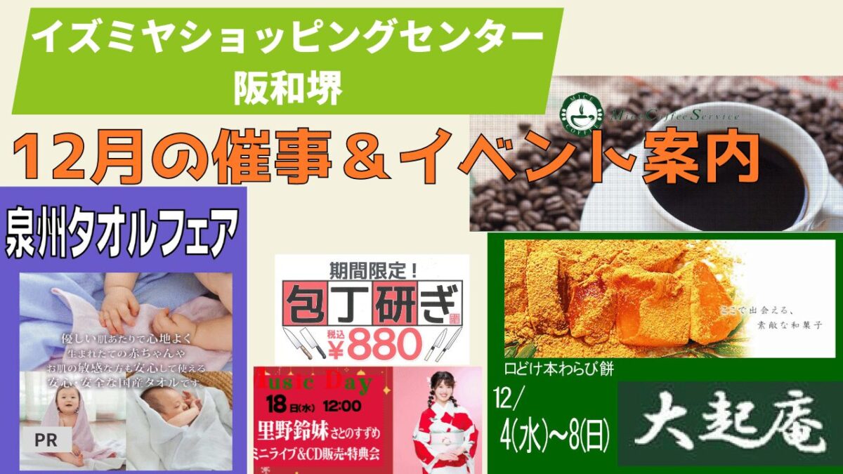 堺市堺区のイズミヤショッピングセンター阪和堺より12月の催事&イベントをご案内! 開催スケジュール 12/4 (水)~8(日) 大起庵 12/11(水)・29( […]