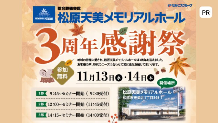 松原天美メモリアルホール3周年感謝祭 松原天美メモリアルホールにて3周年感謝祭が開催されます! 開催日:2024年11月13日(水)・11月14日(木) ◆家族 […]