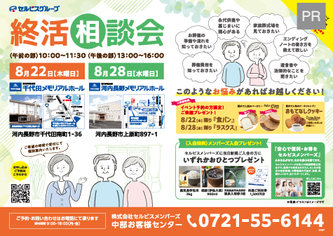 いざというときに慌てないために、お葬儀についての基本的な知識を前もって身につけておきませんか? セルビスグループのメモリアルホールでは定期的にお葬儀のセミナーや […]