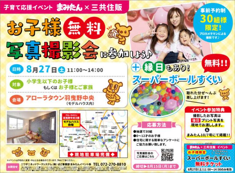 夏休みの思い出に、ご家族の記念に、お子様無料写真撮影会に遊びに来ませんか?