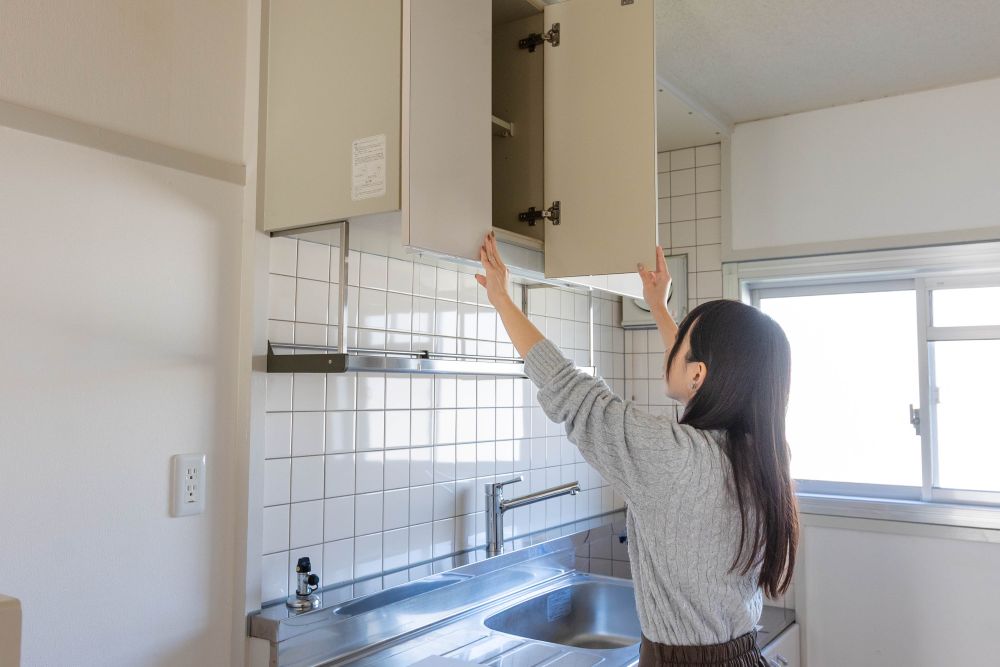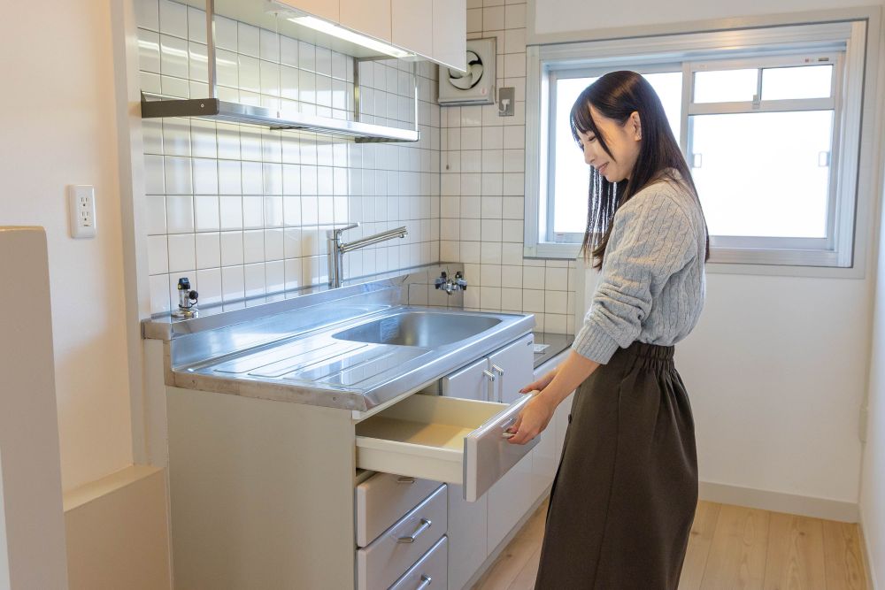 キッチンの収納が充実しているのも嬉しいポイント!私は、白いスクエアタイルのレトロな壁がお気に入りです♪