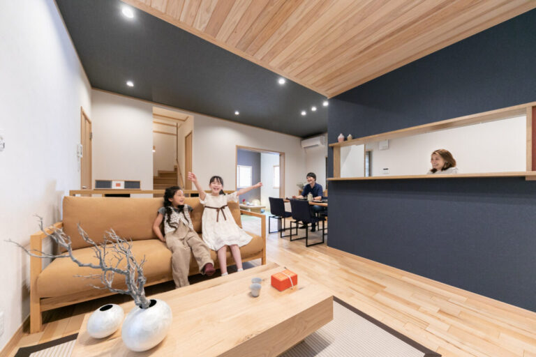 リビングの天井は杉板貼りで、一枚一枚の表情の異なりが自然の温もりを演出。一方で、ダイニングは落ち着いたブラックの天井で全体を引き締めています。